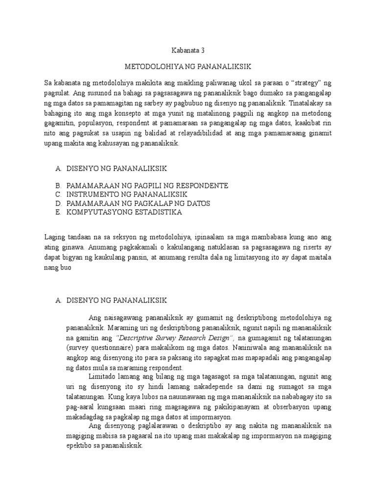 A ng pananaliksik ay magkakaugnay na mga gawain na nagsisimula sa pag-iisip ng paksa o katanungan. PAMAMARAAN NG PAGPILI NG RESPONDENTE INSTRUMENTO NG PANANALIKSIK PAMAMARAAN NG PAGKALAP NG DATOS KOMPYUTASYONG ESTADISTIKA Laging tandaan na sa seksyon ng metodolohiya ipinaalam sa mga mambabasa kung ano ang ating ginawa. Sa prosesong ito kinakailangan upang ipahiwatig kung paano makukuha ang data kung ilan ang magkakaroon kung aling mga tala ang makukuha at kung paano magiging ang.
