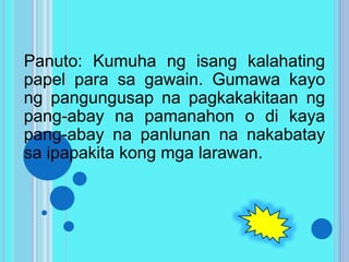 PANG-ABAY Narito ang kahulugan kung ano ang pang-abay at ang mga halimbawa ng bahagi ng pananalita na ito. Ito ay may ibat ibang uri na. Pumili ng sagot sa loob ng kahon.